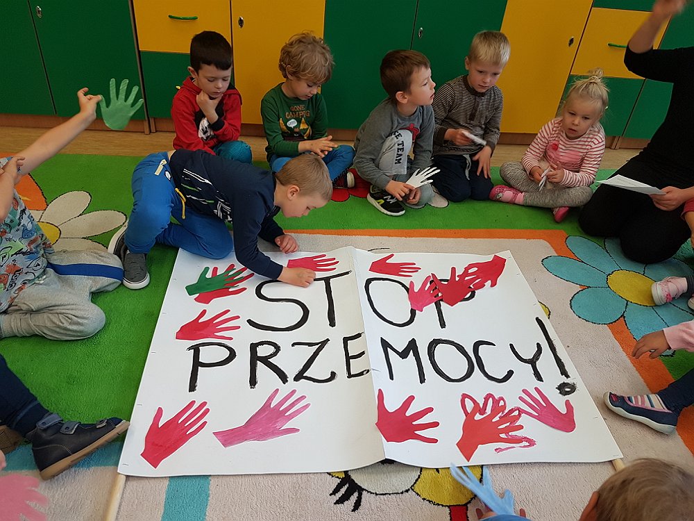 Dnia 2 października 2019 r. Pani Anna Świątek wraz z Panią Martyną Bogusz zorganizowały w przedszkolu Kampanię „Międzynarodowy Dzień Bez Przemocy”. Przedszkolaki wzięły udział w korowodzie po przedszkolu propagując takie wartości i uczucia jak: szacunek do drugiego człowieka, tolerancja, dobroć, miłość. W tym dniu, ale tak naprawdę i w każdym innym, przyświecać powinna nam jedna zasada – zasada unikania przemocy. Nasi przedszkolacy aktywnie włączyli się w obchody Międzynarodowego Dnia Bez Przemocy. Wychowawcy przeprowadzili w grupach pogadanki tematyczne, a każda grupa przygotowała plakat nawołujący do rozwiązywania konfliktów bez użycia przemocy. Bardzo dziękujemy wszystkim wychowawcom grup przedszkolnych za aktywne włączenie się do powyższej akcji.