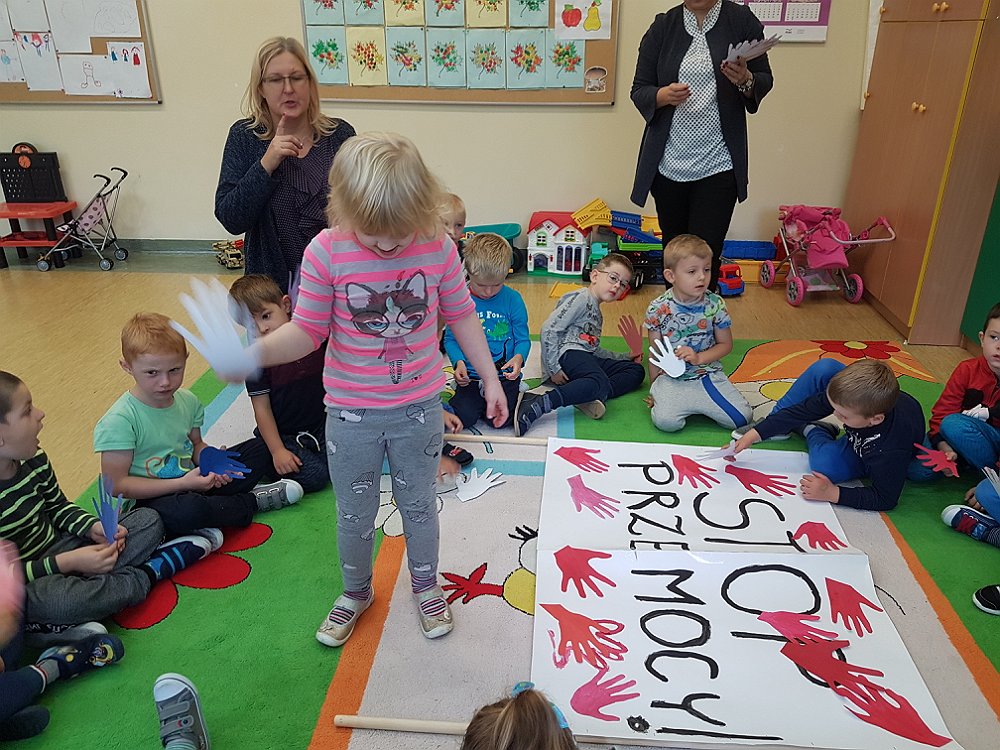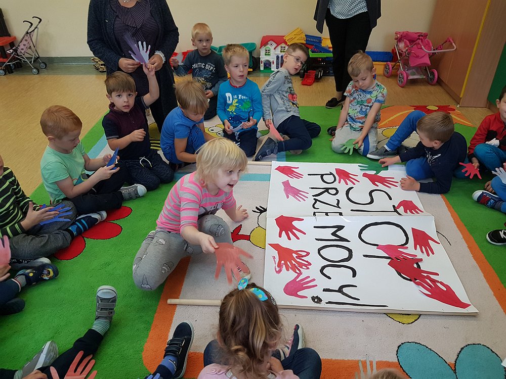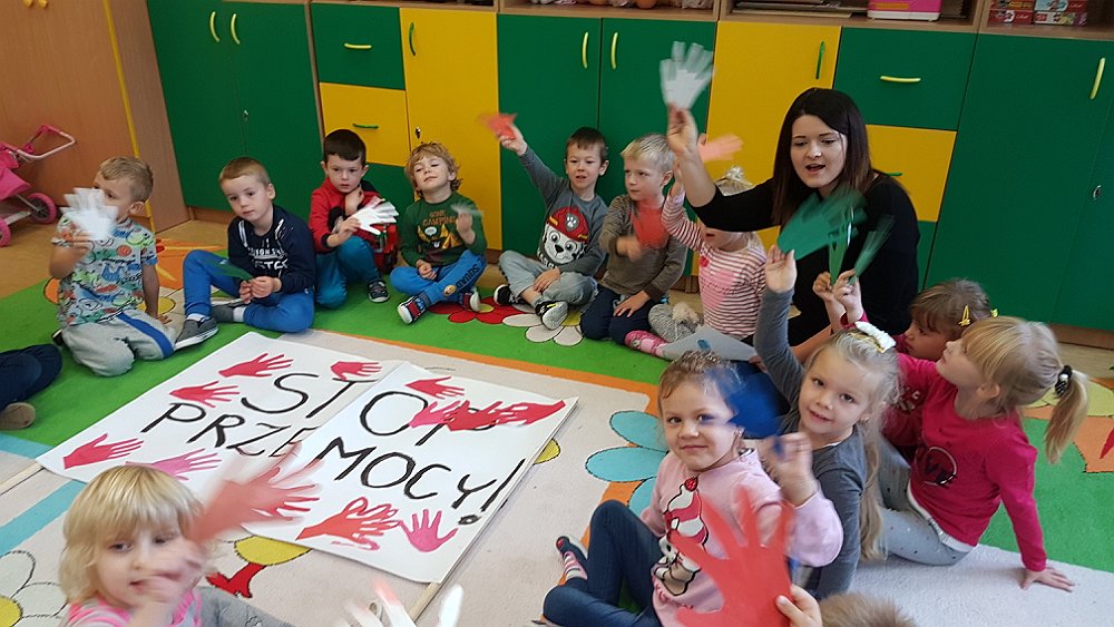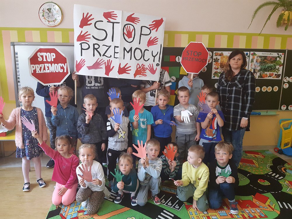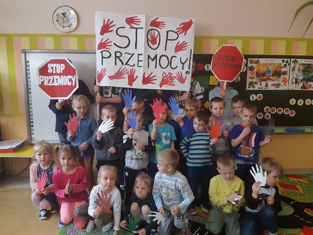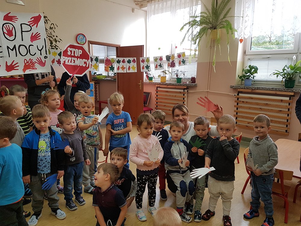 Dnia 2 października 2019 r. Pani Anna Świątek wraz z Panią Martyną Bogusz zorganizowały w przedszkolu Kampanię „Międzynarodowy Dzień Bez Przemocy”. Przedszkolaki wzięły udział w korowodzie po przedszkolu propagując takie wartości i uczucia jak: szacunek do drugiego człowieka, tolerancja, dobroć, miłość. W tym dniu, ale tak naprawdę i w każdym innym, przyświecać powinna nam jedna zasada – zasada unikania przemocy. Nasi przedszkolacy aktywnie włączyli się w obchody Międzynarodowego Dnia Bez Przemocy. Wychowawcy przeprowadzili w grupach pogadanki tematyczne, a każda grupa przygotowała plakat nawołujący do rozwiązywania konfliktów bez użycia przemocy. Bardzo dziękujemy wszystkim wychowawcom grup przedszkolnych za aktywne włączenie się do powyższej akcji.