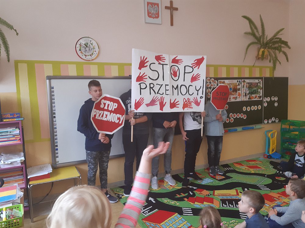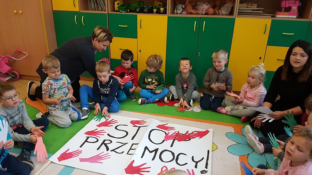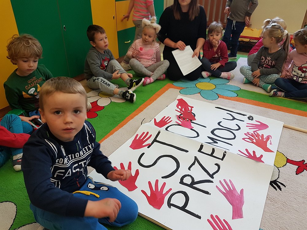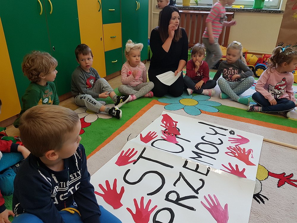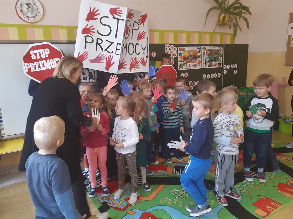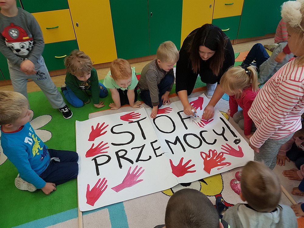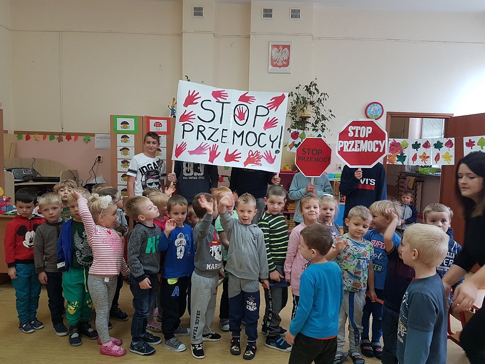 Dnia 2 października 2019 r. Pani Anna Świątek wraz z Panią Martyną Bogusz zorganizowały w przedszkolu Kampanię „Międzynarodowy Dzień Bez Przemocy”. Przedszkolaki wzięły udział w korowodzie po przedszkolu propagując takie wartości i uczucia jak: szacunek do drugiego człowieka, tolerancja, dobroć, miłość. W tym dniu, ale tak naprawdę i w każdym innym, przyświecać powinna nam jedna zasada – zasada unikania przemocy. Nasi przedszkolacy aktywnie włączyli się w obchody Międzynarodowego Dnia Bez Przemocy. Wychowawcy przeprowadzili w grupach pogadanki tematyczne, a każda grupa przygotowała plakat nawołujący do rozwiązywania konfliktów bez użycia przemocy. Bardzo dziękujemy wszystkim wychowawcom grup przedszkolnych za aktywne włączenie się do powyższej akcji.